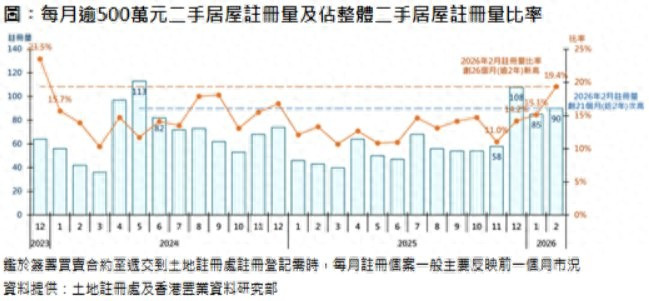 此外,其占整体二手居屋注册量比率亦由1月约15.1%,上升约4.3个百分点,至2月约19.4%,更创26个月即逾2年新高。鉴于签署买卖合约至递交到土地注册处注册登记需时,2月注册个案一般主要反映1月市况。