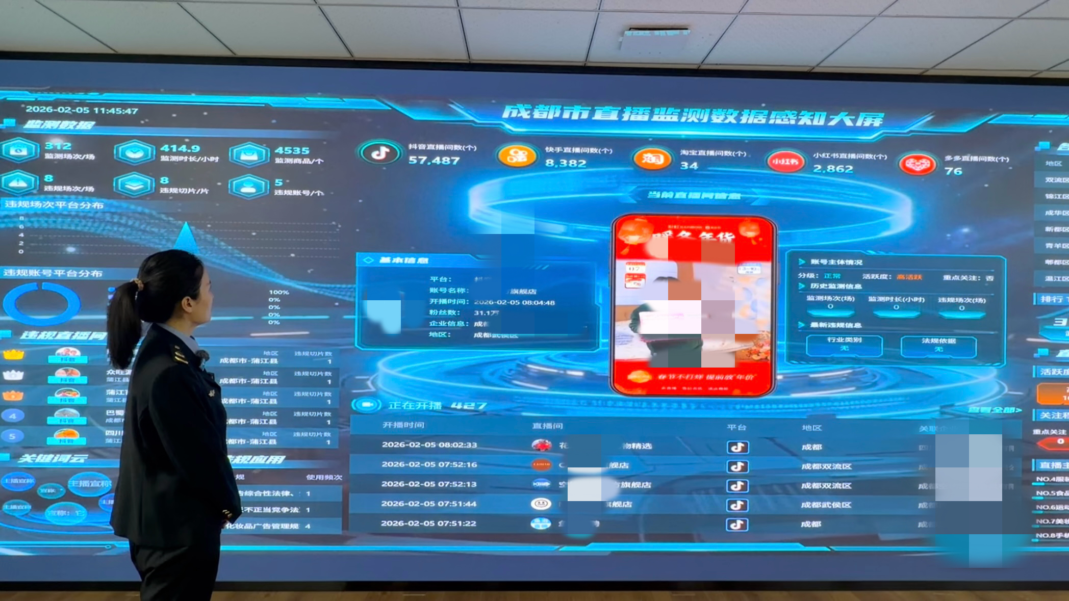 这条预警信息,被马上派发给相关部门。“我们会进一步调查核实,如果确实违规,将依法处理。”成都市市场监管局网监处副处长崔凌介绍,直播内容瞬时传播、主播数量庞大、交易链条复杂,以前靠人工录屏筛查,存在监测效率低、覆盖有盲区、分析结果慢等问题,新系统的上线将改变这一现状。